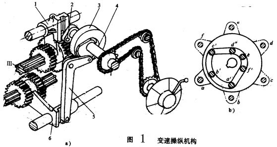 軸Ⅱ上雙聯(lián)齒輪和軸Ⅲ上的三聯(lián)齒輪是用一個(gè)手柄同時(shí)操縱的。變速手柄裝在主軸箱的前壁面,手柄通過(guò)鏈傳動(dòng)使國(guó)4轉(zhuǎn)動(dòng),在軸4上固定有盤(pán)形凸輪3和曲柄2.凸輪3上有一條封閉的曲線槽,它由兩段同半徑的圓弧和直線所組成。凸輪上有6個(gè)不同的變速置,(如圖中以a-f標(biāo)出的位置)。凸輪曲線槽通過(guò)杠桿5操縱軸Ⅱ上的雙聯(lián)滑動(dòng)齒輪。當(dāng)杠桿的滾子心處于凸輪曲線槽的大半徑處時(shí),皮時(shí)齒輪在左端位置;若處于小半徑處時(shí),則移到右端位置。 曲柄2上的圓銷的伸出端套有滾子,嵌在拔叉1的長(zhǎng)槽中。當(dāng)機(jī)柄2隨著軸4轉(zhuǎn)動(dòng)時(shí),可帶動(dòng)撥動(dòng)軸Ⅲ的滑動(dòng)齒輪,使它處于左、中、右三種不同的位置。順次地轉(zhuǎn)動(dòng)手柄至各個(gè)變速位置,就可使兩個(gè)滑動(dòng)齒輪塊的軸向位置實(shí)現(xiàn)6種不同的組合,從面使軸Ⅲ得到6種不同的轉(zhuǎn)速;讫X輪聲色移至規(guī)定的位置后,采用鋼球定位裝置進(jìn)行了可靠的定位。