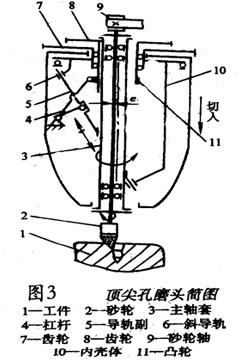 用頂尖孔磨床磨削頂尖孔,如力3所示的頂尖孔磨床,為立式磨床,下面有頂尖撥盤可以帶動(dòng)工件轉(zhuǎn)動(dòng),工件上端支承在由兩小圓柱組成的V形體上,與工件圓柱或圓錐面成線接觸。磨頭有三個(gè)運(yùn)動(dòng):1主切削運(yùn)動(dòng),由砂輪軸9帶動(dòng)砂輪高帶旋轉(zhuǎn);2行星運(yùn)動(dòng),齒輪7帶動(dòng)砂輪軸9作以e為貪偏心量的行星運(yùn)動(dòng);3往復(fù)運(yùn)動(dòng),齒輪7與內(nèi)殼體10及斜導(dǎo)軌6成為一體,由徑向及推力軸承支承作回轉(zhuǎn)運(yùn)動(dòng),齒輪8帶動(dòng)凸輪子11 轉(zhuǎn)動(dòng),并推動(dòng)杠桿4,帶動(dòng)斜導(dǎo)軌副5沿斜導(dǎo)軌作30度往復(fù)滑動(dòng),,克用因砂輪各點(diǎn)線速度不同造成的誤差。該機(jī)床加工精度為圓度0.8ium,,表面粗糙度值為Ra0.32.