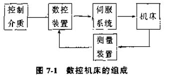 (1)數(shù)控機(jī)床的組成,數(shù)控機(jī)床一般由控制介質(zhì)、數(shù)控裝置、伺服系統(tǒng)和機(jī)床成本體組成。圖7-1的實(shí)線所示為開環(huán)控制的數(shù)控機(jī)床框圖。