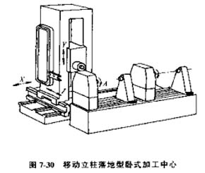 1)落地型(圖7-30)立柱作X、Z向運(yùn)動(dòng),主動(dòng)箱在立柱上作Y向運(yùn)動(dòng),可配備落地式工作臺(tái)及回轉(zhuǎn)工作臺(tái)。適用于大型零件(特別是較長(zhǎng)的零件)或中型零件的多面多工序加工。