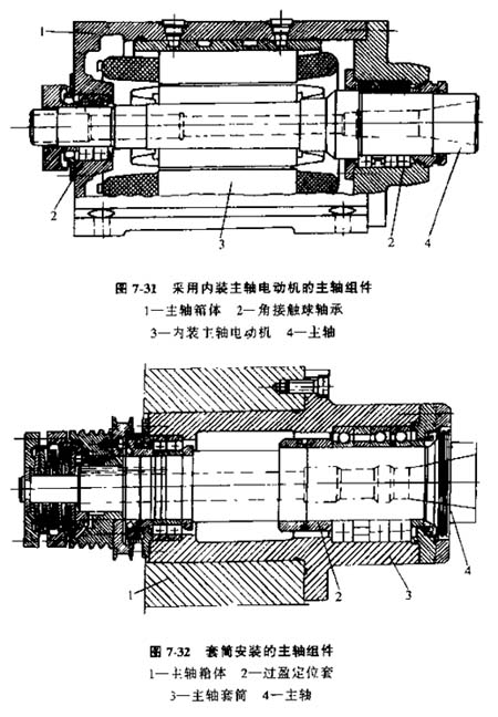圖7-31所示是一種采用內(nèi)裝主軸電動(dòng)機(jī)的主軸組件(圖中為示出裝卸刀具及刀具夾緊機(jī)構(gòu)),簡(jiǎn)化了主傳動(dòng)系統(tǒng)。圖7-32和圖7-33為用套筒安裝的主軸組件,這類主軸組件主軸支承跨距可以較短,主軸傳動(dòng)件位于主軸后部。