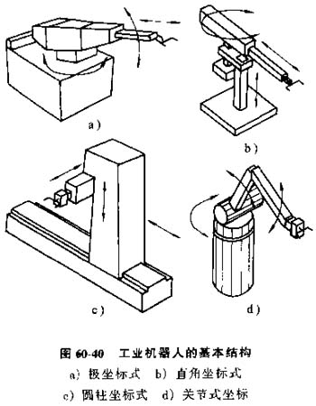 機器人的基本結(jié)構(gòu)有四種:直角坐標、極坐標,圓柱坐標和關(guān)節(jié)式坐標,見圖60-40。
