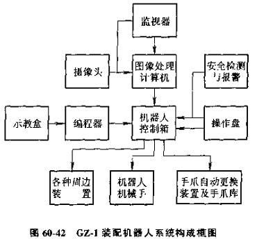 我國(guó)研制CZ-1型高速精度智能裝配機(jī)器人是一種可帶視覺的SCARA型機(jī)器人,具有由直流伺服電動(dòng)機(jī)驅(qū)動(dòng)的四個(gè)自由度。其基本結(jié)構(gòu)框見圖60-42。各部分的功能為: