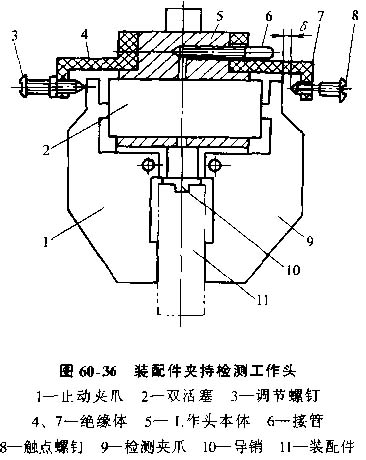 2) 裝配件夾持檢測工作頭,圖30-36所示工作頭根據(jù)夾持動作發(fā)出的信號,壓縮空氣進入接管6,推動雙活塞2,使止動夾爪1及檢測夾爪9閉合,開始夾持裝配件11。正常夾持時在夾爪9與觸點螺釘8之間形成間隙δ,兩者之間斷路。夾持失誤時間隙消失,夾爪9與螺釘8之間形成通路,通過控制回路發(fā)出報警信號。