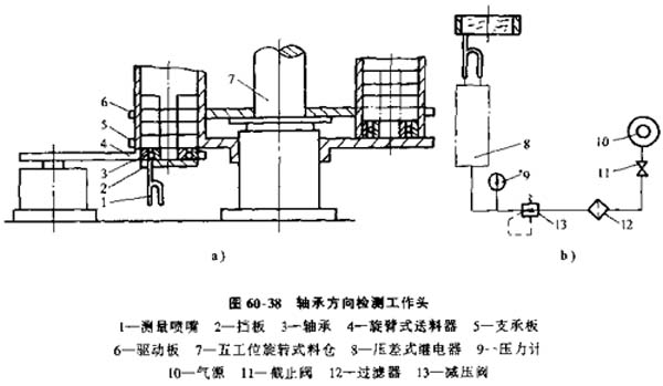 軸承方向檢測工作頭,軸承裝配中往往需要檢測軸承的正反向。用料倉供料時要注意將軸承有防塵蓋的一面朝下。圖60-38所示檢測頭用氣動法檢測軸承方向。