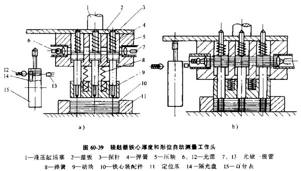 1) 接觸器鐵心綜合檢測工作頭,圖60-39a中為原始位置,測量開始時,崖壓缸活塞1下降,動塊9在彈簧4作用下壓向鐵心裝配件10,將松散的鐵心片壓緊,同時由定位爪11定位。隨著崖壓缸活塞1繼續(xù)下降,6根探桿3插入鐵心裝配件10的鉚釘孔內,然后壓塊5與動塊9接觸并壓向鐵心裝配件10。同時蓋板2與百分表15的觸頭接觸,測量鐵心厚度。觸頭每移動1mm,隔光盤14旋轉一周,光源12發(fā)出的平行線透過隔光盤14上的小孔,給光敏三極管發(fā)出10個信號,輸入控制系統(tǒng)。