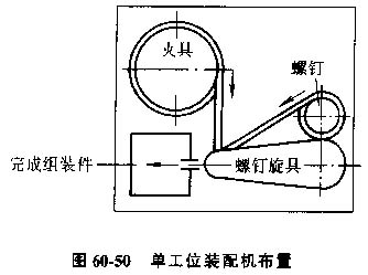 1)剛性單工位裝配機,機電工程中典型的單工位自動裝配機是螺釘自動擰入機。圖60-50為單工位螺釘擰入裝配機的布置圖,由震動料斗,螺釘自動擰入裝置等組成。