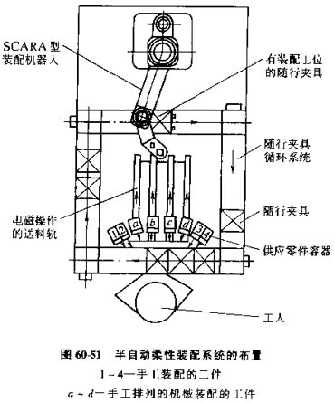 圖60-51所示為一臺半自動柔性裝配的機布置圖,使用一個SCARA型機器人,有一個機器入裝配工位及手工工位,在機器人工位與手工工位之間有一個工件運載系統(tǒng)。1~4等4個零件由手工裝配。多次出現(xiàn)的a~d等4個零件由同一工人手工按一定次序放入電磁送料軌道中,進而逐個被機器人抓取并自動進行裝配。