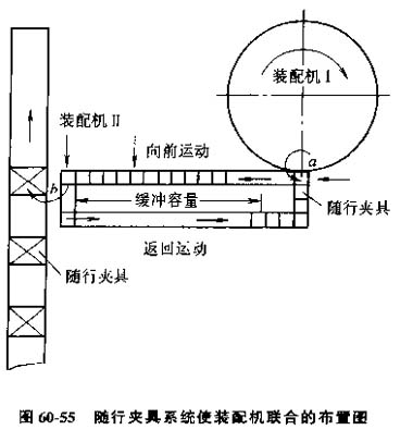 圖60-55所示為一臺回轉(zhuǎn)式裝配機(jī)與儀態(tài)直進(jìn)式裝配機(jī)的組合布置。回轉(zhuǎn)裝配機(jī)I上已裝配的組件先送到a位置的隨行夾具上。由氣動(dòng)裝置將組件從a位置腿到輸送機(jī)輸送帶上送到b位置。傳誦帶的長度決定緩沖區(qū)的容量。直進(jìn)式裝配機(jī)Ⅱ上的處理裝置將組件從b位置放到裝配機(jī)Ⅱ的隨行夾具中、氣動(dòng)裝置將空隨行夾具推倒輸送系統(tǒng)的返回輸送帶上,回到a位置。