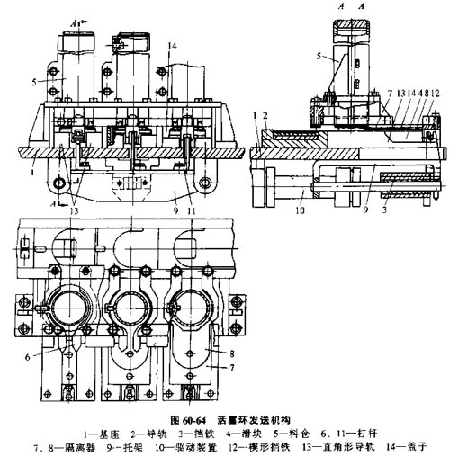 向滑塊上自動(dòng)發(fā)送活塞環(huán)的機(jī)構(gòu),圖60-64機(jī)構(gòu)有一個(gè)基座上緊固著逐個(gè)發(fā)送活塞環(huán)的料倉(cāng)5和杠桿6,在垂直于料倉(cāng)中心線的平面內(nèi)鉸接并用彈簧相互拉緊,還帶有形狀與被夾持的活塞環(huán)相似的輥?zhàn)鱼Q口,以及在料倉(cāng)下垂直其中心線的并在平面內(nèi)能移動(dòng)的隔離器7和8推板做成托架9的形式,并帶有強(qiáng)制性驅(qū)動(dòng)裝置10,推板沿導(dǎo)軌2移動(dòng),用杠桿11與滑塊4相互作用,滑塊上固定隔離器7和8以及楔形擋鐵12,在滑塊工作行程末端與彈簧杠桿6相互作用。滑塊連同不動(dòng)的固定隔離器可以在固定于基座上的直角形導(dǎo)軌13內(nèi)移動(dòng)。隔離器上面用蓋子14蓋住,靜止地架在直角形導(dǎo)軌13上面