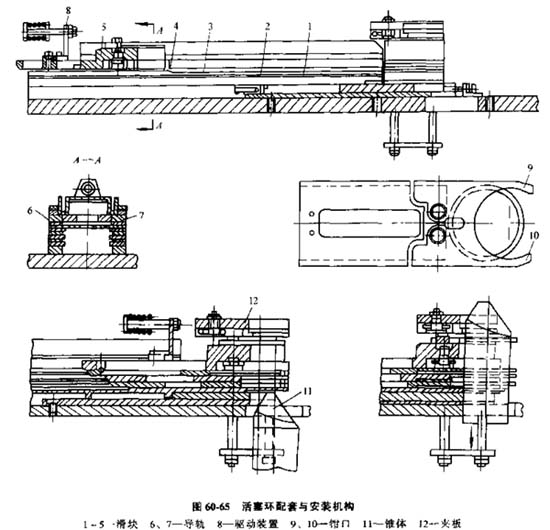 A. 在活塞槽中安裝活塞環(huán)的機構(gòu),圖60-65機構(gòu)做成盒子形狀,盒子的壁由滑塊1、2、3、4、5形成,每一個滑塊帶一套活塞環(huán)中、的一個;瑝K依次安排在導(dǎo)軌6和7上。導(dǎo)軌具有斜角,可將活塞環(huán)壓在安裝基準中,在起始位置上,這個些滑塊的端部構(gòu)成了一個朝向工作區(qū)的臺階,除最底下的一個滑塊外,每一個滑塊都有一塊擋鐵,作為推桿來推動其下面的滑塊;上面的滑塊4與往復(fù)運動驅(qū)動裝置8相連;瑝K的端部作成兩鉗口9和10,相互之間為彈性聯(lián)系。在導(dǎo)軌6和7上,滑塊按活塞環(huán)的給定高度配置。從專用的盒狀料倉中通過導(dǎo)軌的縫隙拉出活塞環(huán)。當滑塊5運動時,由于位于滑塊4槽上的擋鐵帶動滑塊4,類似地使滑塊3等移動。每一滑塊確定的間隙在自己的導(dǎo)軌上移動。接著又沿導(dǎo)軌的斜面移動,滑塊一個個地堆積起來。此時,每個活塞環(huán)以自己的大部分端面支撐在踝塊張開的爪上,并被上面滑塊壓住。