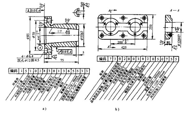 JLBM-1編碼系統(tǒng)由15個碼位組成(見圖5-3),其中主碼9位,輔碼6位。主碼的第一、第二位為名稱類別矩陣,主要反映零件的功能和主要結(jié)構(gòu),第三至第九位表示零件在形狀與加工方面的各種特征。6位輔碼則分別代表零件的材料、毛坯、熱處理、主要尺寸和精度等有關(guān)信息。每一碼位包括0~9的十個特征項。JLBM-1為混合式結(jié)構(gòu),名稱類別分回轉(zhuǎn)件和非回轉(zhuǎn)件兩大類,各自成樹狀結(jié)構(gòu),各類的第三至第九位碼分別成鏈?zhǔn)浇Y(jié)構(gòu),輔碼也是鏈?zhǔn)浇Y(jié)構(gòu)。JLBM-1系統(tǒng)的特點是零件類別按名稱類別矩陣劃分,便于設(shè)計、檢索;分類表簡單,定義明確,容易掌握;碼位適中,又有足夠的信息容量。圖5-4表示了回轉(zhuǎn)體和非回轉(zhuǎn)體零件用該分類編碼系統(tǒng)進行編碼的示例。