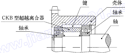 CKB型即國外B200系列,為無內(nèi)環(huán)無軸承支撐的楔塊式超越離合器。使用時,將軸直接安裝在離合器內(nèi),用于離合器的軸在磨削后需要熱處理,硬度達到HRC58~62,軸的錐度每50mm不應超過0.01mm。為保證軸和離合器外的同心度,承受外環(huán)和軸的徑向或軸向負載,要在離合器的兩端或一端裝上軸承。適用于極限轉(zhuǎn)速為:1000~2400r/min,公稱轉(zhuǎn)矩為:60~1250N·m。常用于包裝機、制袋機、瓦楞紙生產(chǎn)線、減速機、提升機、電動滾筒等機械傳動。