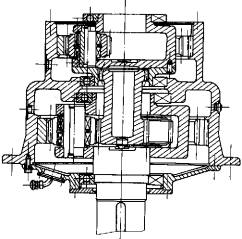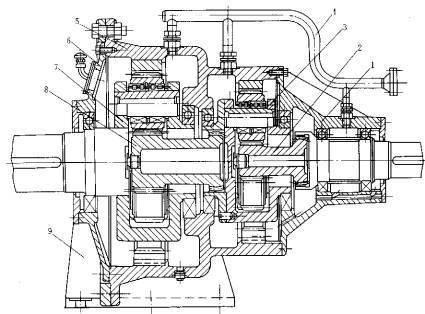 1—輸入軸 2—太陽輪 3—輸入行星架 4—潤滑管路 5—機體 6—后機蓋 7—輸出行星架