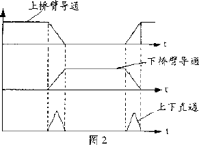 在小車動作的過程中,我們要不斷 地使電機在四個象限之間切換,即在正 轉(zhuǎn)和反轉(zhuǎn)之間切換,也就是在S1、S2導(dǎo)通且S3、S4關(guān)斷,到S1、S2關(guān)斷且S3、 S4導(dǎo)通,這兩種狀態(tài)之間轉(zhuǎn)換。在這種 情況下,理論上要求兩組控制信號完全互補,但是,由于實際的開關(guān)器件都存在 開通和關(guān)斷時間,絕對的互補控制邏輯 必然導(dǎo)致上下橋臂直通短路,比如在上橋臂關(guān)斷的過程中,下橋臂導(dǎo)通了。這個過程可用圖2說明。