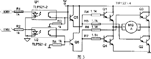 由于電機在正常工作時對電源的干擾很大,如果只用一組電源時會影響單片機的正常工作,所以我們選用雙電源供電。一組5V給單片機和控制電路供電,另外一組9V給電機供電。在控制部分和電機驅(qū)動部分之間用光耦隔開,以免影響控制部分電源的品質(zhì),并在達林頓管的基極加三極管驅(qū)動,可以給達林頓管提供足夠大的基極電流。圖3所示為采用TIP122的驅(qū)動電機電路,IOB8口為“0”,IOB9口輸入PWM波時,電機正轉(zhuǎn),通過改變PWM的占空比可以調(diào)節(jié)電機的速度。而當(dāng)IOB9口為“0”,IOB8口輸入PWM 波時,電機反轉(zhuǎn),同樣通過改變PWM的占空比來調(diào)節(jié)電機的速度。