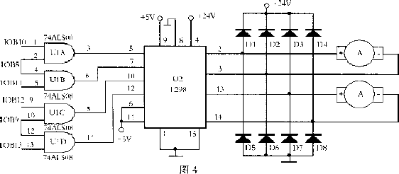 圖4為采用內(nèi)部集成有兩個橋式電路的專用芯片L298所組成的電機驅(qū)動電路。驅(qū)動芯片L298是驅(qū)動二相和四相步進電機的專用芯片,我們利用它內(nèi)部的橋式電路來驅(qū)動直流電機,這種方法有一系列的優(yōu)點。每一組PWM波用來控制一個電機的速度,而另外兩個I/O口可以控制電機的正反轉(zhuǎn),控制比較簡單,電路也很簡單,一個芯片內(nèi)包含有8個功率管,這樣簡化了電路的復(fù)雜性,如圖所示IOB10、IOB11控制第一個電機的方向,IOB8輸入的PWM控制第一個電機的速度;IOB12、IOB13控制第二個電機的方向,IOB9輸入的PWM控制第二個電機的速度。