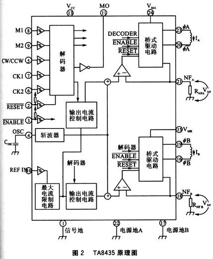 從圖2中可以看出,TA8435主要由1個(gè)解碼器、2個(gè)橋式驅(qū)動(dòng)電路、2個(gè)輸出電流控制電路、2個(gè)最大電流限制電路、1個(gè)斬波器等功能模塊組成。