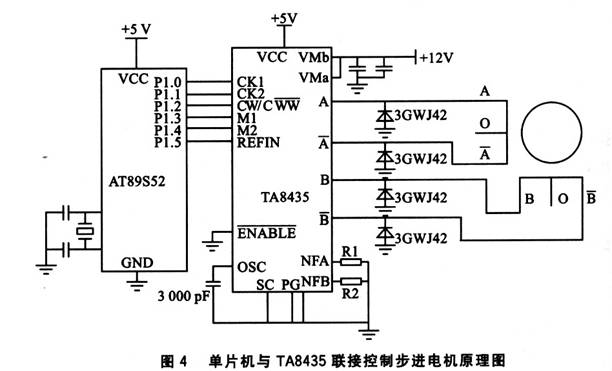 圖4是單片機(jī)與TA8435相連控制步進(jìn)電機(jī)的原理圖。引腳M1和M2決定電機(jī)的轉(zhuǎn)動(dòng)方式:MI=0、M2=O,電機(jī)按整步方式運(yùn)轉(zhuǎn);Ml=1、M2=0,電機(jī)按半步方式運(yùn)轉(zhuǎn);M1=O、M2=1,電機(jī)按1/4細(xì)分方式運(yùn)轉(zhuǎn);Ml=1、M2=1,電機(jī)按l/8步細(xì)分方式運(yùn)轉(zhuǎn)。CW/CWW控制電機(jī)轉(zhuǎn)動(dòng)方向,CKl、CK2時(shí)鐘輸入的最大頻率不能超過(guò)5 kHz?刂茣r(shí)鐘的頻率,即可控制電機(jī)轉(zhuǎn)動(dòng)速率。REFIN為高電平時(shí),NFA和NFB的輸出電壓為0.8 V,REFIN為低電平時(shí),NFA和NFB輸出電壓為0.5 V,這2個(gè)引腳控制步進(jìn)電機(jī)輸入電流,電流大小與NF端外接電阻關(guān)系式為:,Io=Vref/Rnf。圖4中,設(shè)REFIN=l,選用步進(jìn)電機(jī)額定電流為0.4 A,Rl、R2選用1.6 Ω、2W的大功率電阻,O、C兩線不接。步進(jìn)電機(jī)按二相雙極性使用,四相按二相使用時(shí)可以提高步進(jìn)電機(jī)的輸出轉(zhuǎn)矩。D1~D4快恢復(fù)二極管用來(lái)泄放繞組電流。