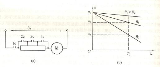 當(dāng)負(fù)載一定時,隨著串入的外接電阻Rw的增大,電樞回路總電阻R=(Ra+Rw)增大,電動機轉(zhuǎn)速就降低。其機械特性如圖1(b)所示。Rw的改變可用接觸器或主令開關(guān)切換來實現(xiàn)。