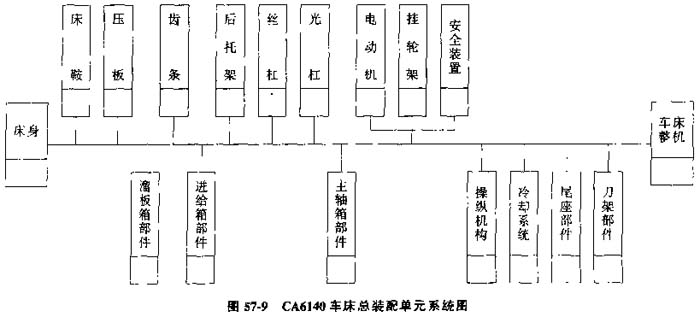 裝配單元系統(tǒng)圖(圖57-9)直觀地表示出產(chǎn)品的劃分及其裝配順序。習(xí)慣上先繪出一條永橫線,在橫線的左端繪出代表基準(zhǔn)件的長(zhǎng)方格,右端繪出代表產(chǎn)品的長(zhǎng)方格。圖中每一零、部件都用長(zhǎng)方格表示,方格中可以注明裝配單元的名稱、數(shù)量和編號(hào)。將零件繪在橫線上面,部件繪在橫線下面。