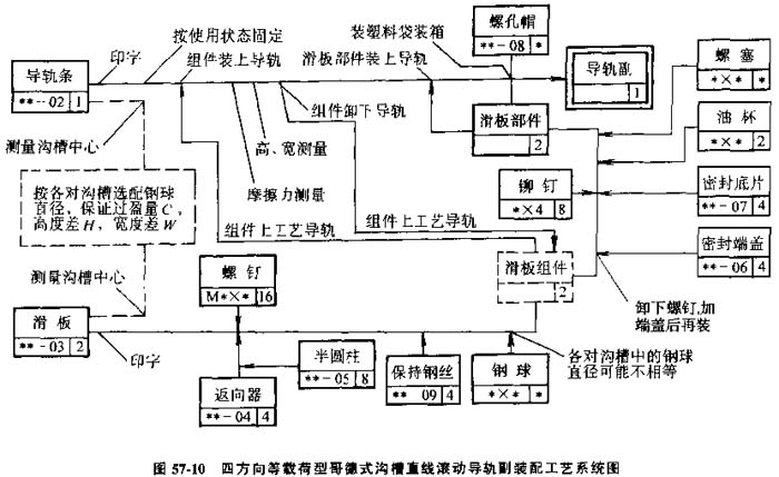 在裝配單元系統(tǒng)圖上,加注必要的工藝說(shuō)明,如焊接、配鉆、攻螺紋、檢測(cè)及在裝品的移位、翻轉(zhuǎn)等,則夠成裝配工藝系統(tǒng)圖,見(jiàn)圖57-10。