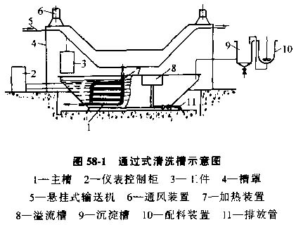 為了提高清洗作業(yè)的勞動生產(chǎn)率。可以采用例如圖58-1所示的帶有傳送機,根據(jù)工件的質(zhì)量大小選擇適當?shù)膫魉脱b置,如地面式傳送小車或履帶式傳送機等等。對于大型工件,一般采用進、出清洗槽。