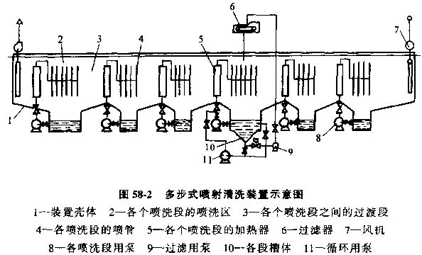 (2)噴射清洗裝置,噴射清洗裝置通過泵將清洗液噴射到工件表面。圖58-2為一種多室式多步清洗裝置示意圖,該裝置包括:裝置殼體、槽體、噴射系統(tǒng)、清洗液加熱裝置和通風裝置等,其核心系統(tǒng)為噴射系統(tǒng)。