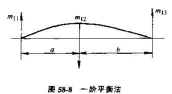 3)進行撓性轉子一階振型的高速動平衡,見圖58-8。取平衡轉速為第一臨界轉速的0.9或1.1倍及三個平衡校正面。在中間的平衡校正面中加上平衡質量-m12,兩邊的平衡校正面中分別加上m11、 m13,滿足m12=+ m11= m13和m11×a =m13×b使平衡質量的合力和合力矩均零。