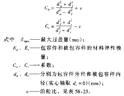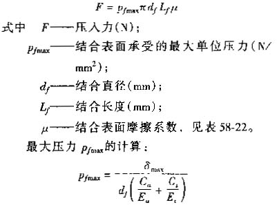 6)用壓力機壓入時,壓入前應(yīng)根據(jù)零件的材料和配合尺寸,計算所需的壓入力。壓力機的壓力一般應(yīng)為所需壓入力的3~3.5倍,壓入力的計算方法如下: