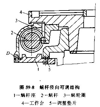 實現(xiàn)側(cè)隙調(diào)整可用徑向調(diào)或軸向可調(diào)結(jié)構(gòu),蝸桿徑向可調(diào)結(jié)構(gòu)見圖59-8。這種蝸桿傳動的加工工藝一般是:待蝸輪圈3裝合在刮研好的工作臺4上精加工無論癡面后,按齒面接觸斑點分布狀況,配磨蝸桿2的齒面。在檢驗機上按一定的中心距,檢查蝸輪齒面接觸斑點,確保在規(guī)定的嚙合側(cè)隙情況下達到正常接觸,然后進行裝配。裝配時,先刮研蝸桿座1的裝配基準D,并保證蝸桿座上裝蝸桿的軸承孔的軸線對D面的平行度精度。配磨調(diào)整墊片5,以保證蝸桿軸線位于蝸輪齒的中央截面內(nèi)。同時徑向微調(diào)蝸桿座,達到規(guī)定的接觸斑點后,配鉆、鉸蝸桿座與底座的定位銷孔,裝上定位銷,擰緊螺釘。