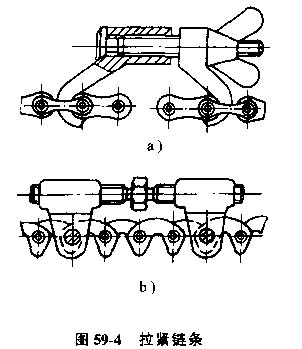 當兩輪中心距離可調且鏈輪在軸端時,可以將鏈條兩端預先接好,再裝到鏈輪上,如果受結構限制,只能先將鏈條套在鏈輪上再進行連接,此時可以采用專用的拉緊工具,見圖59-4。