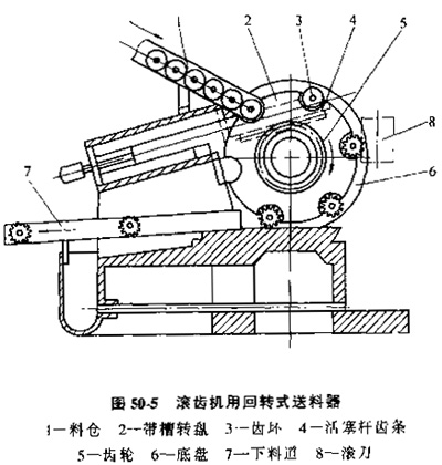 A.回轉(zhuǎn)式送料器,圖50-5是滾齒機(jī)上用的回轉(zhuǎn)式送料器,當(dāng)帶狗槽的轉(zhuǎn)盤旋轉(zhuǎn)時(shí),槽口順次經(jīng)過料倉(cāng)的靠口處,單個(gè)工件落入槽口。轉(zhuǎn)盤外圓柱面為工件止動(dòng)面兼隔料作用。隨著轉(zhuǎn)盤的間歇轉(zhuǎn)動(dòng),坯料被送到加工工位,加工完的工件被送至下料道。