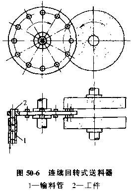 d.連續(xù)式送料器,圖50-6為雙端面磨床上采用的連續(xù)回轉(zhuǎn)的送料圓盤進(jìn)行送料的原理圖。工件是活塞銷、圓柱滾子,挺桿體異類的零件。工件2從輸料管1中依靠重力作用或用上料桿推入送料圓盤的接料孔中,被帶入砂輪磨削區(qū)進(jìn)行加工。