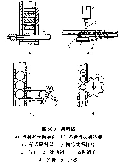 50-7a為利用直線往復(fù)式送料器的表面隔料。圖50-7b是利用氣缸和彈簧傳動(dòng)的隔料器,隔料銷子在彈簧4作用下插入料槽,擋住工件,當(dāng)氣缸1驅(qū)動(dòng)銷2插入料槽將第二個(gè)件隔位時(shí),其前端頂在擋板5上,使銷子退出料槽,將第一個(gè)工件放行。圖50-7c為機(jī)械傳動(dòng)的銷式隔料器,圖50-7d為槽輪式隔料器。