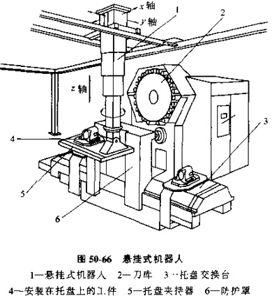 采用空架導(dǎo)軌的懸掛機器人,也屬于一種變化發(fā)展出的有軌小車,見圖50-66。在廠房內(nèi)安裝了架在空中的導(dǎo)向?qū)к墸瑧覓焓綑C器人可以由電動機拖動在導(dǎo)軌上行走,工件以及安裝工件托盤,可以由機器人的支持架托起,并可上下移動和旋轉(zhuǎn)。由于機器人可以自由地在x、y方向上移動,它就可以將工件連同托盤移動到導(dǎo)軌允許到達的任意位置上交換托盤和工件。
