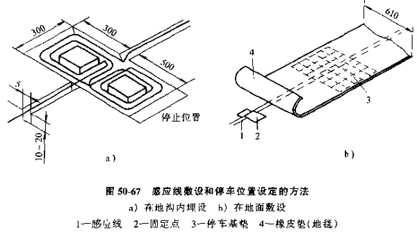 線導(dǎo)小車的導(dǎo)向方法是靠在地面敷設(shè)電磁感應(yīng)導(dǎo)線來引導(dǎo)小車,感應(yīng)線的敷設(shè)和停車位置的設(shè)定方法見圖50-67,過去因為感應(yīng)線埋沒在地溝內(nèi),要改變小車的行駛路線仍然比較困難,現(xiàn)在已可以采用帶狀導(dǎo)線或磁線涂料直接在地面上敷設(shè),所以大大增強了柔性制造系統(tǒng)布局的柔性,這種小車的緩沖自停精度較差。約為±30mm。若想達到較高的定位精度。需使用圓錐支點等機械定位裝置,使其定位精度可達±0.1mm。