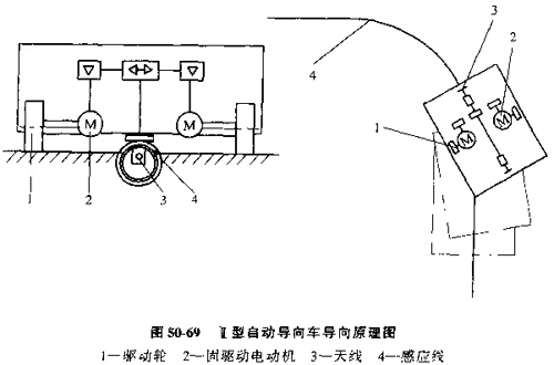 圖50-69所示是Ⅱ型自動導(dǎo)向車的導(dǎo)向原理圖。當(dāng)天線3偏離導(dǎo)向感應(yīng)線4的左右任一側(cè)時。大線中的一對線圈的輸入信號(感應(yīng)電壓)就產(chǎn)生了信號差,通過控制系統(tǒng),使左右兩驅(qū)動電動機2產(chǎn)生轉(zhuǎn)速差,經(jīng)驅(qū)動輪1使小車沿感應(yīng)線轉(zhuǎn)向,甚至信號差為零。