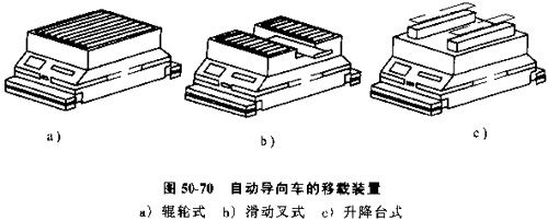 依載裝置。在小車的臺面上設(shè)置托盤或工件的傳送和接收裝置,以實現(xiàn)與機床或裝卸站之間的自動交換聯(lián)接,圖50-70所示是裝在小車臺面上的幾種移載裝置。