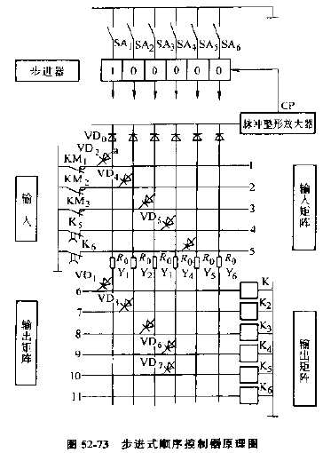 圖52-72是步進(jìn)式順序控制器的結(jié)構(gòu)框圖。現(xiàn)場(chǎng)信號(hào)通過(guò)輸入部分加到輸入矩陣,經(jīng)過(guò)輸入矩陣的邏輯運(yùn)算控制步進(jìn)器步進(jìn),步進(jìn)器R在輸出矩陣邏輯配合下送出信號(hào),完成控制過(guò)程。
