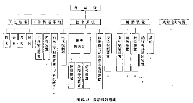 自動線由基本工藝設(shè)備、各種輔助設(shè)備以及控制系統(tǒng)等所組成。根據(jù)工件的具體情況、工藝要求、工藝過程、生產(chǎn)率要求和自動化程度等因素,自動線的結(jié)構(gòu)及復(fù)雜程度有很大差別,自動線的基本組成部分見圖52-43。