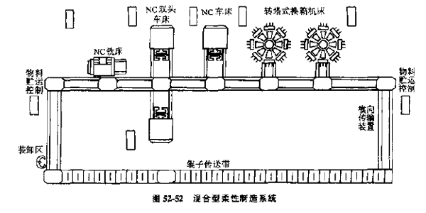 (3)混合型系統(tǒng),實(shí)際生產(chǎn)中常常采用既按工序選擇,又具有替換機(jī)床的柔性制造系統(tǒng),圖52-52所示即為這兩者兼有的混合型系統(tǒng),圖中配置了兩臺(tái)數(shù)控車床和兩臺(tái)轉(zhuǎn)塔式換箱鏜床,在同類機(jī)床間具有性戶替換的能力。