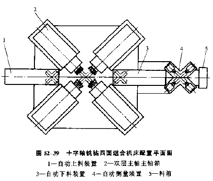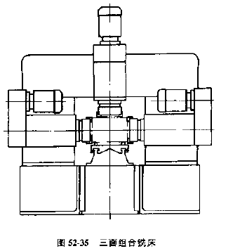 在對(duì)氣缸體。氣缸蓋、齒輪箱等箱體零件進(jìn)行平面加工時(shí),為了提高工序集中程度,可以對(duì)工件同時(shí)從兩面或三面進(jìn)行銑削,圖52-35所示為三面組合銑床的機(jī)床配置方案。