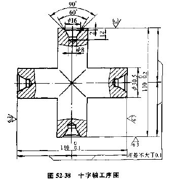 十字軸為鋼件,需要在四個(gè)軸頸上銑端面及鉆中心孔,見(jiàn)圖52-38。