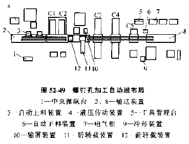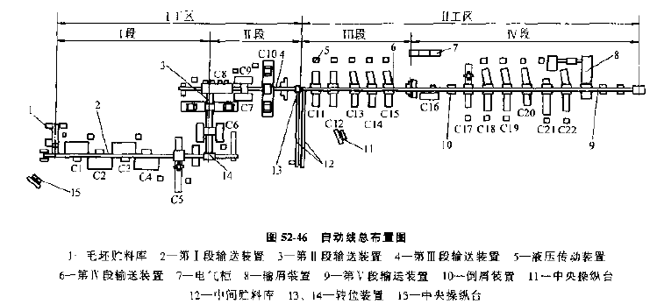 自動(dòng)線(xiàn)總布局見(jiàn)圖52-48,圖52-49、圖52-50,三條自動(dòng)線(xiàn)由20臺(tái)機(jī)床組成,每條自動(dòng)線(xiàn)都有單獨(dú)的自動(dòng)上下料裝置。