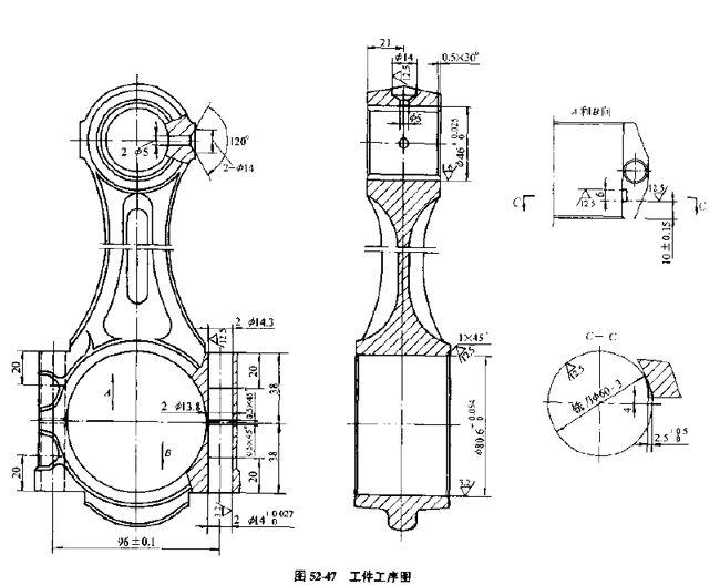 該自動(dòng)線(xiàn)用于連桿大,小頭孔粗加工,半精加工及螺釘孔加工,加工工件見(jiàn)圖52-47,工件材質(zhì)為45鋼。