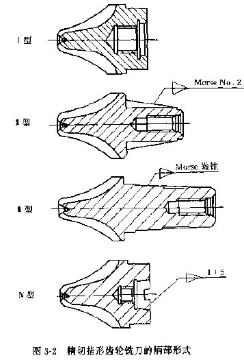 根據(jù)指形銑刀直徑的大小,其柄部的定位形式可分別采用內(nèi)圓與端面同時定位或采用內(nèi)圓錐與端面同時定位圖3-2中的Ⅰ、Ⅳ型,模數(shù)較小時可采用外圓錐定位見圖3-2中的Ⅱ、Ⅲ型,并用螺桿拉緊。