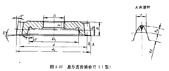 GB6081—85《直齒插齒刀的基本型式和尺寸》中規(guī)定了模數(shù)1~12mm,分度圓壓力角為20°的盤(pán)形直齒插齒刀(Ⅰ型)、碗形直齒插齒刀(Ⅱ型)和錐柄直齒插齒刀(Ⅲ型)三種。盤(pán)形直齒插齒刀主要用于加工外齒輪和大直徑的內(nèi)齒輪,以及齒條等,其公稱(chēng)分度圓直徑有75,100,125,160和200mm五種,精度等級(jí)分AA、A、B三種,盤(pán)形直齒插齒刀的型式和尺寸見(jiàn)圖3-37和表3-72~表3-77、表3-85~表3-90。