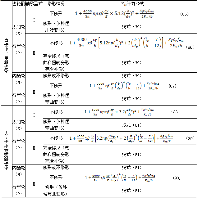 符合項(xiàng)a)中條件的行星傳動(dòng)中的各齒輪副:太陽(yáng)輪(S)/行星輪(P)、內(nèi)齒輪(H)/行星輪,其KHβ可按表13中的公式計(jì)算。計(jì)算時(shí)應(yīng)取