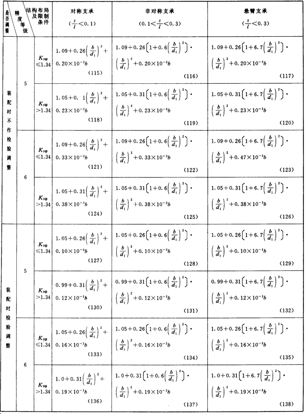 齒輪第Ⅲ公差組精度為5~8級(jí)(硬齒面為5~6級(jí))及相應(yīng)的結(jié)構(gòu)布局限制條件的KHβ簡(jiǎn)化計(jì)算公式見(jiàn)表14或表15。